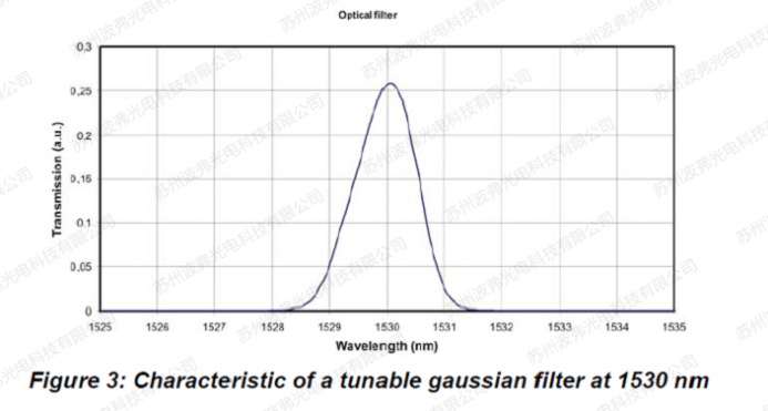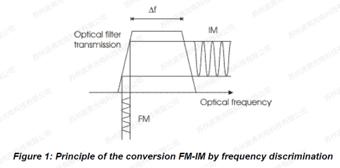 頻率鑒別(Frequency discrimination)用于啁啾測量。它只是在調制器的輸出端引入一個光學濾波器。為了該濾波器的頻率響應與所用激光器的相匹配,可以使用可調諧濾波器。該濾波器必須在激光光源的波長范圍內具有近似線性的斜率,比如,高斯濾波器是在傳輸峰值一半的位置。可以證明,純相位調制也可以表示為頻率調制。頻率偏移的幅度與頻率成正比。頻率越高,掃描的頻率范圍越寬。