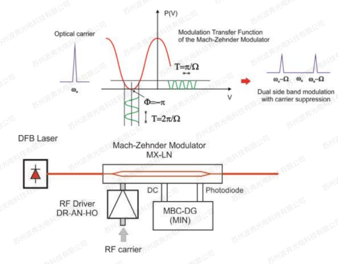 以上兩種方式,如果僅需要單邊帶,均需要FBG過濾掉不希望的多階光譜。而FBG多為定點頻率和帶寬,這無形中限制了這種方案在掃頻方面的應用。而且,FBG一般較好的投射/反射率<99%,僅僅相當于20dB的載波或邊帶抑制比,在一些特定應用中,希望得到更高的抑制比時這兩種方案就顯得無能為力了。為了解決上面的問題,一種新的載波抑制-單邊帶調制方案就應運而生了。