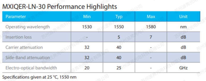 iXblue的MXIQER-LN-30是一款高帶寬,低插損,高抑制比的雙平行M-Z調制器,iXblue 專利技術“Magic Junction” (patent n° US2008193077)保證高達30dB以上的載波和邊帶抑制比。