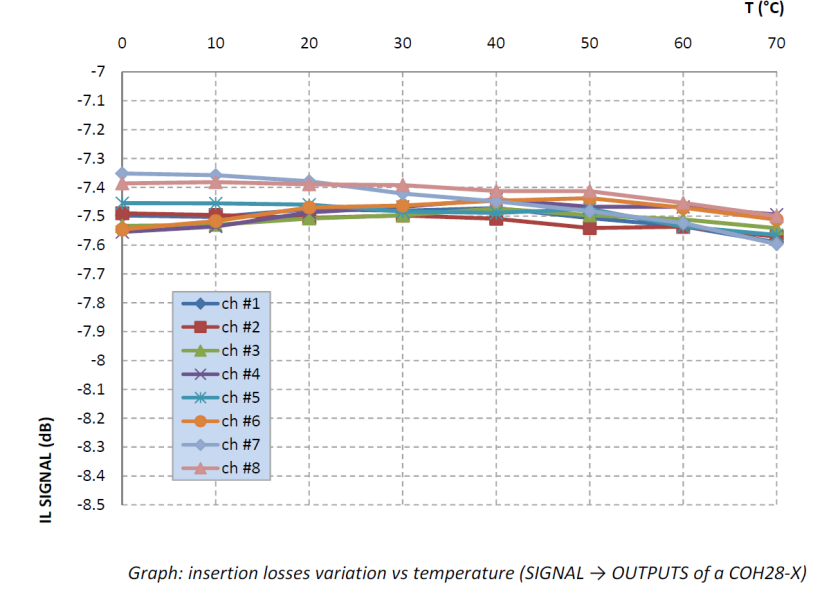 感謝最初為電信行業(yè)開發(fā)的環(huán)氧樹脂技術(shù),iXblue器件可以提供穩(wěn)定、堅固的特性。下圖為COH光混頻器優(yōu)異的溫度性能,插損隨溫度的變化極小,滿足苛刻環(huán)境下的應用要求。