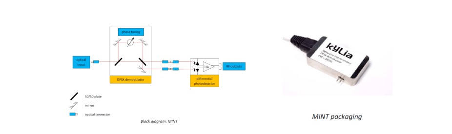 當對傳輸速率的需求高于Gbit/s時,必須開發(fā)新的調(diào)制和解調(diào)技術(shù)。基于自由空間設計和長期的電信技術(shù)背景,iXblue能夠為這種復雜的解調(diào)提供各種產(chǎn)品。其中一系列產(chǎn)品(iXblue MICS系列(超鏈接),請聯(lián)系我們提供更多資料)致力于多路復用和解復用,這意味著能夠在一根獨特的光纖中傳輸許多不同波長的激光(即40路不同波長的激光束在一根典型的電信光纖中傳輸,1528至1560 nm,C波段,)。另一系列產(chǎn)品(iXblue MINT系列,見下圖)使用光的另一個特性進行解調(diào),即電磁波的相位,相位(0或π)的調(diào)制比強度的調(diào)制更容易、更快。MINT產(chǎn)品使光學DPSK(差分相移鍵控)解調(diào)成為可能,它適用于大約10 Gbit/s的更高傳輸速率。(MINT:延遲線干涉儀,DPSK解調(diào)器)