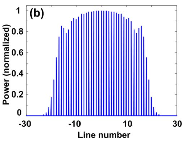 光學頻率梳(Optical Frequency Comb)是由一系列離散、等間距的規則光脈沖序列組成,能夠在一個頻段內同時提供幾個至上百個個不同的頻率成分。具有梳線數目多、頻率范圍廣等優勢,且具有固定的頻率間隔等,能夠代替多個激光器,是理想的多載波光源。