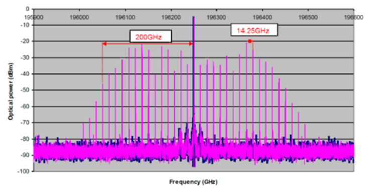 基于鈮酸鋰電光調制器所產生的光學頻率梳,原理是通過鈮酸鋰相位調制器(Phase Modulator),鈮酸鋰強度調制器(Intensity Modulator)的邊帶產生(參考微信公眾號:使用電光調制器實現邊帶調制),通過串聯鈮酸鋰相位調制器、強度調制器實現高平坦度(~2dB),多梳線光學頻率梳產生,最終產生上百個梳線的頻率梳?;阝壦徜囌{制器產生的光學頻率梳具有中心頻率已于調節,重復頻率可控等優勢。
