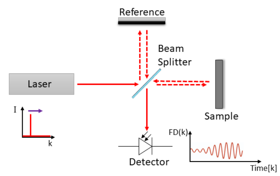 圖1:相干探測(cè)示意圖:波長(zhǎng)可調(diào)激光器被分割為參考,再次組合的樣本/場(chǎng)景及其與光電探測(cè)器的檢測(cè),由數(shù)字化儀和快速傅立葉變換獲取,得出距離(+速度)