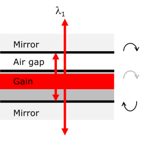 圖2:帶襯底反射鏡、增益區(qū)、氣隙和頂部反射鏡的MEMS-VCSEL示意圖。