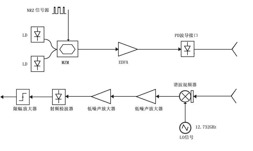太赫茲頻段由于其寬帶特性,在通信、雷達、特征頻譜檢測等領域具有巨大應用潛力。為了使短距離無線通信的數據速率達到10Gbps,利用光電結合技術以THz波段(125GHz)為載波,建立太赫茲無線通信系統。如下圖所示使用62.5GHz信號調制光波,通過平面分波電路產生相隔0.125THz光信號,此光信號受發射數據的調制,然后進入PD,進行光電轉換,產生0.125TH組的調制波,經過放大后饋入天線發射,接收端經天線后進入低噪放,檢波成基帶信號,經過放大,數據恢復。